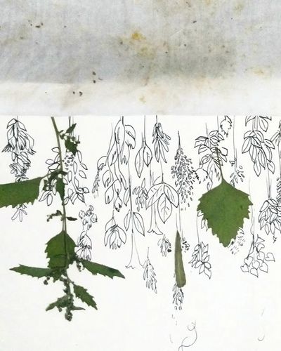 El otro espacio de esta intervención es un jardín al fondo en el que se conserva una fitolaca, planta medicinal que erróneamente es considerada plaga y que fue encontrada en el edificio. Con esta planta se tiñó la tela suspendida en el muro. En este mismo espacio habrá un fogón con una olla de barro en donde se estarán realizando preparaciones, vaporizaciones, teñidos y tinturas durante el tiempo que permanezca la intervención.